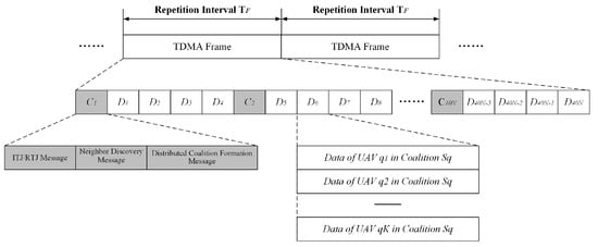 Assume that in the TDMA multi-UAV network, each UAV-i has a fixed transmitting time slot i, . When a UAV coalition is formed, the member in the coalition can transmit packets on the time slot of the whole coalition member, since they have no collision with each other. Considering that all the N UAVs are selfish and rational, we formulate their decision-making process as a coalition formation game, unlike the canonical coalition game.