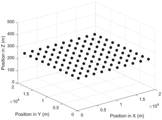 We consider a static grid topology involving 100 UAV nodes. Figure 5 shows the 100-UAV-node grid topology, where the distance between two neighboring UAVs is 2 km.