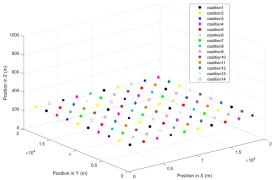 As an example, in Figure 1, we assume that the 16 UAVs in the multi-UAV network form a given partition: . The payoff of UAV-1 is , since there is only one player in the coalition and one slot to transmit. Then, the utility of the coalition is . In the coalition , the two elements are so far away that they have no collision with each other. Thus, UAV-3 and UAV-16 can transmit packets in the two time slots simultaneously, the payoff of UAV-3 or UAV-16 is , and the utility of coalition is . While in coalition , the arbitrary element is in the communication range of another element, the time slots cannot be shared to transmit packets simultaneously, and the payoff of an arbitrary UAV in the coalition is . Therefore, the utility of coalition is . The utility of the remaining coalitions can be calculated in the same manner. Thus, the utility of the coalitional structure can be calculated as .