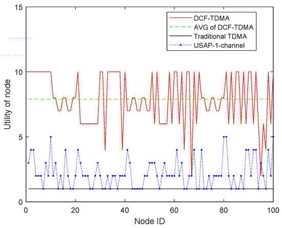 The utilities of every UAV node are given in Figure 8. The average utility of DCFG-TDMA proposed in this paper is 7.9 slots. The max utility and the min utility of DCF-TDMA are 10 and 3 slots, respectively. Compared to that of the Traditional TDMA and USAP, the average utility is improved significantly. This is because, although the USAP algorithm is capable of reusing time slot resources, the distributed selection process still encounters numerous conflicts, making it impossible to achieve an optimal time slot allocation outcome.