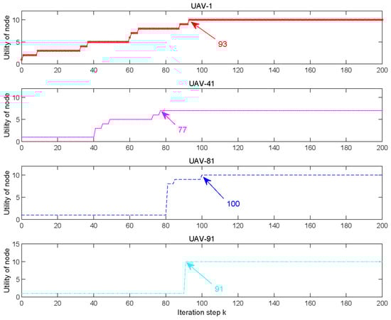 The utilities of four UAV nodes (UAV-1, UAV-41, UAV-81, UAV-91) versus the iteration step are shown in Figure 9. UAV-1 and UAV-91 achieve the maximum utility at step 93, UAV-41 achieves the maximum utility at step 77, and UAV-81 achieve the max utility at step 100.