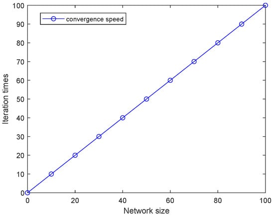 The convergence speed of the algorithm versus network size is given in Figure 10. The number of iterations is linearly related to the network size for the grid topology, which is a regular topology in which each UAV node achieves stable partitioning within one iteration.