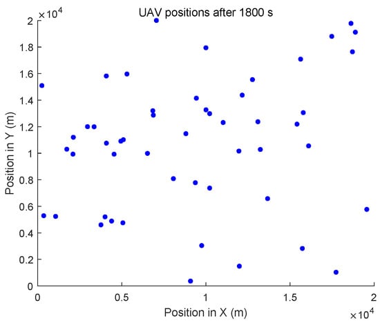 In the dynamic topology environment, UAVs randomly select a direction and a speed (≤5 m/s) for their flight. The initial positions of all UAVs are different. The positions after flying for 1800 s are shown in Figure 11.