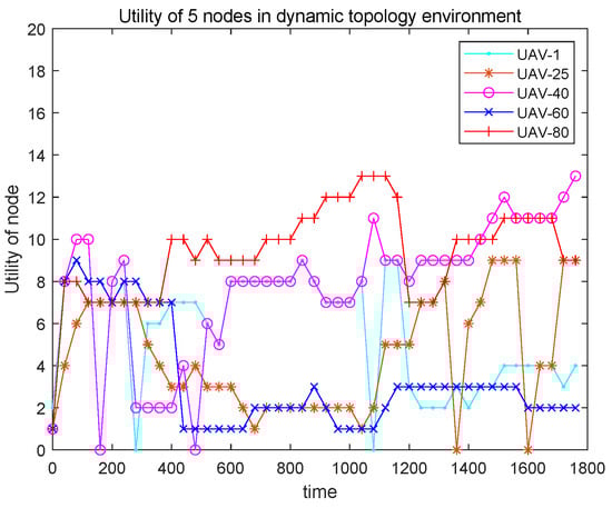 The utilities of the 5 UAV nodes in a dynamic topology environment.