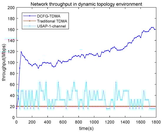 The performance of network throughput in the dynamic topology environment is shown in Figure 13. Compared to traditional TDMA and USAP, the throughput of the proposed DCFG-TDMA protocol improves significantly.