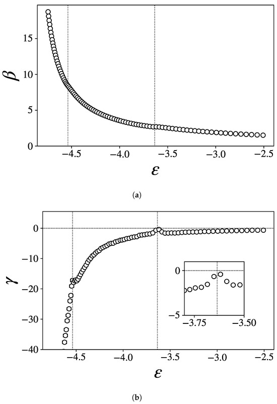 emphasizing that the observed singular behavior of can, in principle, originate from an analogous singularity of the first-order derivative of the entropy, or from its second-order derivative approaching zero. Furthermore, while, in the canonical ensemble, the average specific energy , where is the energy density, usually displays clear critical behaviors at the transition temperature, the microcanonical ensemble inverse temperature is often much less sensitive.