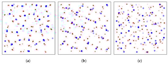 Instantaneous sample configurations projected onto a arbitrary planes, at energy density (a) , (b) , and (c) . Particles of species 1(2) are represented in large blue and small red circles, respectively.