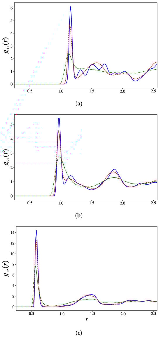 Radial pair distribution function for (a) 1–1 bonds, (b) 2–2 bonds, and (c) 1–2 bonds. The continuous blue lines, dashed red lines and dotted-dashed green lines correspond to systems with , and , respectively.