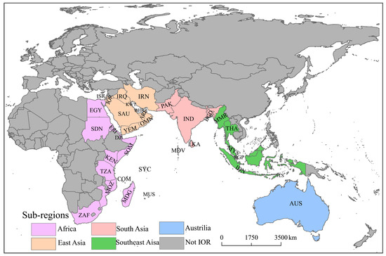 The IOR is a strategically vital maritime corridor connecting the Pacific and Atlantic Oceans and is situated between the eastern coasts of Africa, Asia, and Australia. Academically, the IOR is defined in broad and narrow terms [1,2]. The narrow definition focuses on the 36 coastal countries bordering the Indian Ocean [5]. This study adopted the narrow definition due to its emphasis on maritime transport and trade. Under this narrow definition, the IOR includes Australia in Oceania, six Southeast Asian nations, five South Asian nations, 11 West Asian nations, and 13 African nations (Figure 1). These countries play crucial roles in the context of maritime transportation, international trade, and geoeconomic activities.