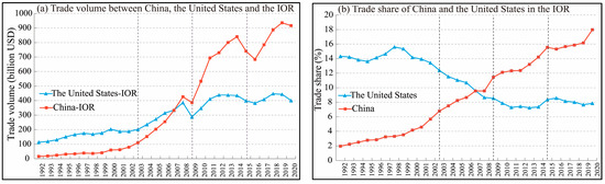 Trade volumes and shares of China and the United States with the IOR from 1992 to 2020.