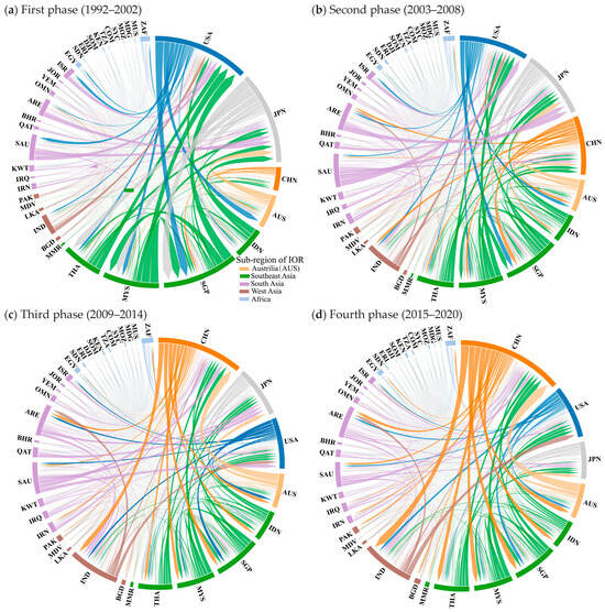 China and the United States have established differentiated functional positions in the IOR trade landscape. China has solidified its position as a principal trading partner through sustained export competitiveness, which functioned as the primary supplier of medium-technology manufactured goods for numerous IOR economies. Conversely, although the United States’ post-Cold War hegemonic dominance in the IOR trade weakened, it maintains structural leverage as a critical export market for IOR nations. These trade patterns, visualized through chord diagrams, revealed asymmetric interdependencies, with China reinforcing its supply-side significance and the U.S. maintaining demand-side predominance in regional trade dynamics.