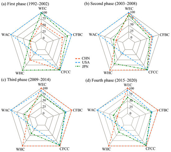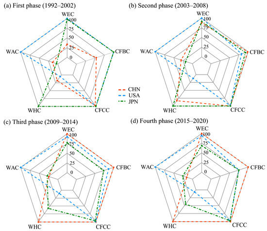 Radar chart visualization of the five weighted centrality indicators for China and the United States over the four phases (1992–2020). Note: CFBC and CFCC denote the current flow betweenness and closeness centralities, respectively, while WEC, WAC, and WHC refer to the weighted eigenvector, authority, and hub centralities, respectively.