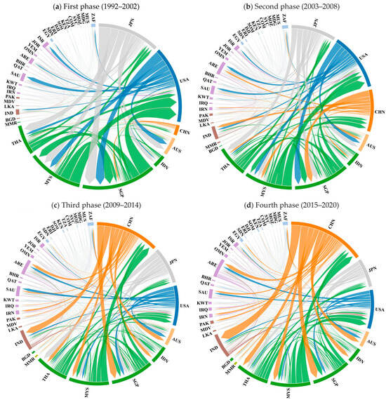 Chord diagrams clearly and intuitively represent how the trade linkages evolved between China, the United States, and the IOR countries (Figure 3). The node sizes in the diagrams correspond to each country’s total trade volume, while the thickness of each chord represents the intensity of the trade flow. Across the four phases, the chord diagrams highlight China’s growing trade engagement with the IOR countries, contrasted by a relative decline in the trade presence of the United States in this region.