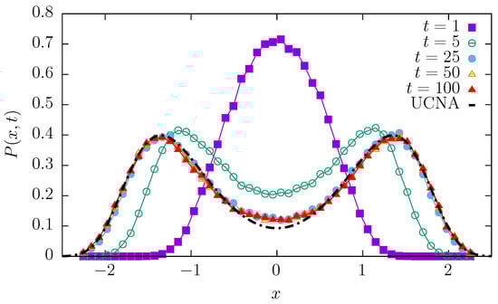 Since OU noise constitutes the crucial part of the models studied within the current research study, we verify if indeed it produces the bimodal stationary state in the quartic potential that we are going to use in the proper model under investigation. Figure 1 presents time-dependent probability densities for and with and 40,000. Such an apparently large value of noise intensity was selected to assure the bimodality of the stationary state. Nevertheless, the large value of D is compensated by the small value of , as in Equation (2), GWN is multiplied by the factor. In Figure 1, the UCN approximation is depicted as the dot-dashed line. In the limit, the time-dependent density approaches the bimodal shape predicted by the UCNA. For systems driven by OU noise, bimodality emerges due to competition between the deterministic restoring force and the correlated noise. For single-well potential, the deterministic force tries to push back all the probability mass to the origin, while the correlated noise is capable of producing a series of subsequent jumps in one direction. Such jumps allow particles to escape from the origin, resulting in the robust depletion in the probability mass and the emergence of bimodality. Consequently, for the quartic single-well potential, the bimodal stationary state can be recorded.