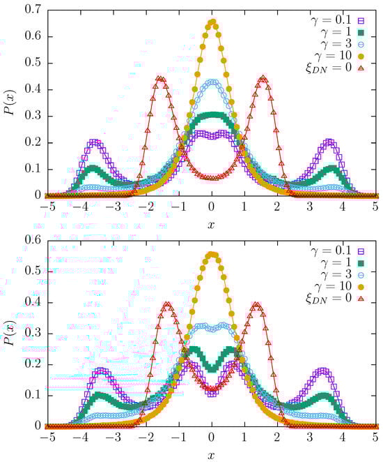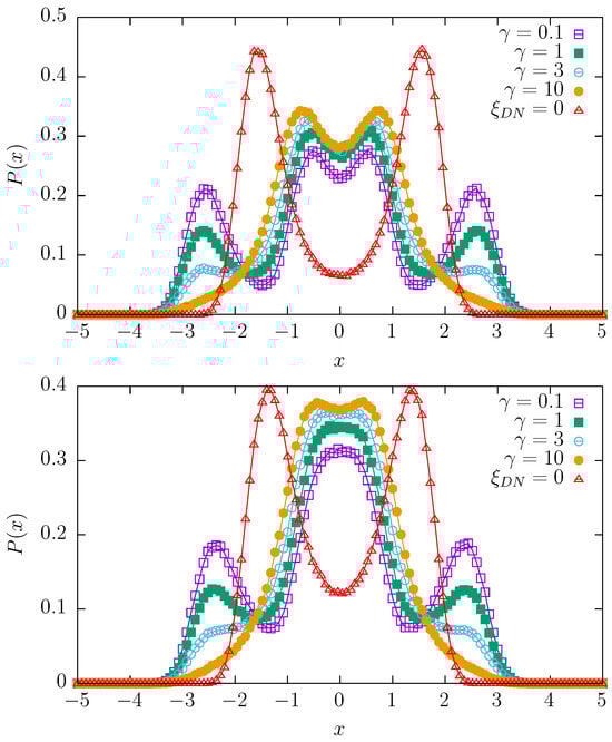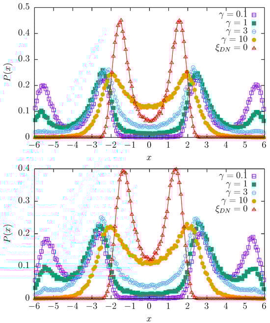 Figure 2, Figure 3 and Figure 4 present stationary states for various switching rates and various values of the dichotomous noise . The Ornstein–Uhlenbeck noise is characterized by with 40,000, which is the basic choice for the random potentials model; see Figure 1. In every figure, the top panels correspond to the (purely) quartic potential, i.e., while bottom panels correspond to the mixture of quartic and parabolic potentials, i.e., . In every plot, the solution corresponding to is plotted with red triangles and schematically labeled as . For the mixture of quartic and parabolic potentials (bottom panels of Figure 2, Figure 3 and Figure 4), this solution is the stationary solution of the model studied in the final part of Section 2.1; see Figure 1. Therefore, in order to show how the action of the dichotomous noise changes the stationary states, the stationary, reference state from Figure 1 is also included in the bottom panels of Figure 2, Figure 3 and Figure 4. It is worthy to mention that the results for are practically indistinguishable from the results for .