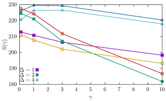 To characterize the ordering role of the dichotomous noise, the Shannon entropy corresponding to the steady states shown in Figure 2, Figure 3 and Figure 4 is calculated. Figure 5 shows the Shannon entropy as a function of the switching rate of the dichotomous noise. The different curves correspond to different values of ; see Equation (11). The full symbols correspond to the pure quartic potential ( and ), while the empty symbols correspond to the quartic potential with harmonic addition ( and ); see Equation (10). From Figure 2, Figure 3 and Figure 4, it can be seen that with the increase in , the stationary states become more localized as the level of multimodality decreases. Figure 5 confirms that as switching rate of the dichotomous noise increases, the system becomes more ordered as the Shannon entropy typically decreases. An analogous effect will be visible in the 3D case (see below).