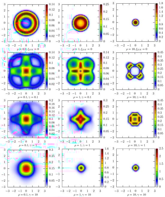 Figure 6 and Figure 7 present results for the 2D potential given by Equation (12) with . Figure 6 depicts 2D stationary densities , while in Figure 7, marginal densities are displayed. Due to the system symmetry, the densities have the same shape as . The top row corresponds to the fixed single-well quartic potential , i.e., the 2D random potential (12) without temporal modulation, which is used as the reference case. The subsequent rows correspond to the randomized 2D potential (12) with various values of the mean switching rate characterizing dichotomous noises. Finally, various columns show results for different characterizing the additive Ornstein–Uhlenbeck noise. At the same time, the intensity D is kept constant, i.e., 40,000. Consequently, the top row generalizes the results of Ref. [] to the 2D case. For the stationary states are spherically symmetric. For not too large , i.e., long enough correlation time , the minimum of the stationary probability density function is at the origin. With the decrease in correlation time, the stationary density becomes unimodal. This transition is very well visible in the top row of Figure 7, which presents marginal probability density . Additional action of symmetric Markovian dichotomous noises can induce dynamic multimodality with a non-trivial spatial pattern, as it is visible in the second and third rows of Figure 6. The minima of the 2D stationary states are recorded not only on the diagonals but also on the axes. Finally, for large switching rates (see the bottom row of Figure 6), the stationary states are unimodal and close to being approximately spherically symmetric. The shape of the marginal densities (see Figure 7) is derived from the complex shape of the 2D stationary states (see Figure 6). Analogously, as in the 1D case (see Figure 5), the Shannon entropy characterizing the stationary states decreases as the switching rate of the dichotomous noise increases.