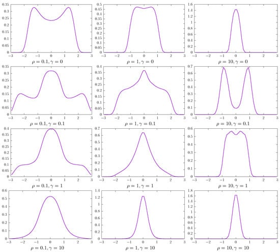 From Figure 2, Figure 3 and Figure 4, one can conclude that for the appropriate choice of parameters, in comparison to the reference solution corresponding to the absence of dichotomous noise, the number of modes can be increased or decreased. In particular, one observes bimodal, trimodal, and four-modal stationary states. It is also possible to produce a unimodal stationary state. Interestingly, an increase in , i.e., the values of the dichotomous noise, non-trivially changes the shapes of the stationary densities. The action of the dichotomous noise is not limited only to the shifting in the modes of the stationary densities outwards but also affects the modality of the stationary states. For instance, for with , the stationary states are unimodal (see Figure 3), while for and , they are bimodal (see Figure 2 and Figure 4).