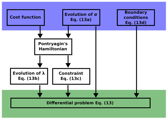 Scheme of the optimal control strategy leading to the differential system Equation (13).