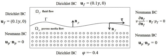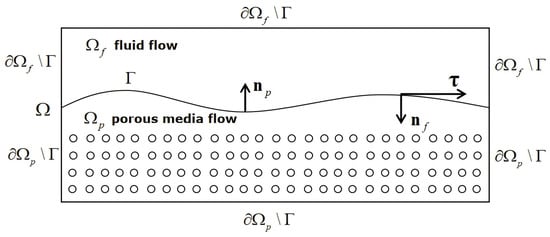 The second interface condition (8) is the balance of the normal forces across the interface. The third one (9), known as the Beavers–Joseph–Saffman law [,,], states that the slip velocity along the interface is proportional to the shear stress along the interface.