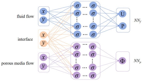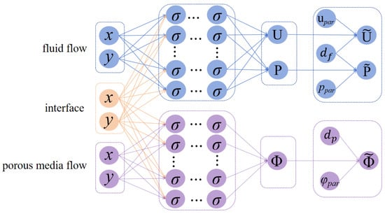 According to the literature research, most of the current studies on deep learning for solving PDEs are for problems controlled by a single set of physics equations, while there are fewer studies on the Stokes/Darcy coupled problem []. In 2022, R. Pu et al. investigated the steady Stokes/Darcy coupled problem by using PINNs and proposed a strategy to improve the accuracy []. In 2023, J. Yue et al. proposed Coupled Deep Neural Networks (CDNNs) for solving the time-dependent Stokes/Darcy coupling problem []. Ref. [] investigated the neural network solution method for the forward and backward problems of the Navier–Stokes/Darcy coupling problem based on PINNs. However, the fitting accuracies of the existing studies are low, with the relative error remaining between 10−2 and 10−4, and these studies primarily focus on regular regions and straight-line interfaces.