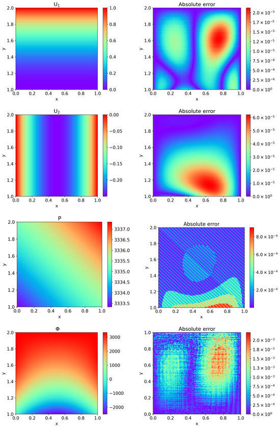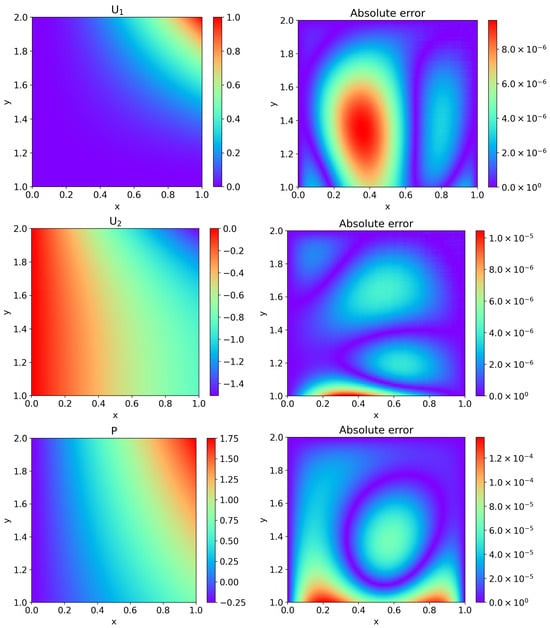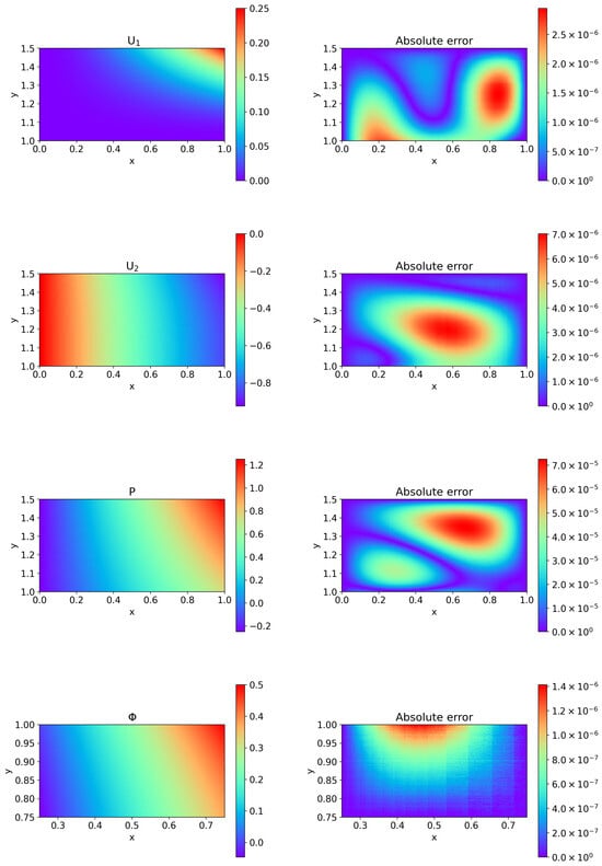 Comparison of the predicted values by HC-PPINNs and the exact solutions for Example 2 when , where the neural networks have three hidden layers and 16 neurons in each hidden layer. (Left) The left column is the predicted velocity in the x direction of fluid flow, the predicted velocity in the y direction of fluid flow, the predicted pressure P of fluid flow, and the predicted of porous media flow, respectively. (Right) The right column is the corresponding absolute error between the predicted values and the exact solutions.