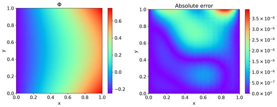 Our experiments are based on Python 3.8.19, TensorFlow 2.0.0, and Keras 2.3.1, and the computer is configured as an Intel(R) Core (TM) i5-8300H. If not specified, in the following numerical experiments the network and will use the same number of hidden layers and the same number of neurons in each hidden layer. We employ Xavier initialization, tanh activation function, a learning rate of 1 × 10−4, and iterations 1 × 104. For the collocation points, we take , , . The weight parameters and are all set to 1.