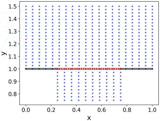 The sampling area and sampling points of Example 3. The black points ‘∘’ are boundary points, which will be treated in a “soft” manner, the red points ‘★’ are interface points, and the rest are residual points of equations.