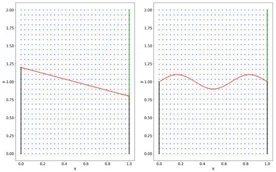Let in , in , on , and boundary points on , on be the set of randomly selected collocation points. Here, , , and are the numbers of collocation points in the interior of the domain , , and , respectively; and are the numbers of the collocation points on the boundary of and , respectively.