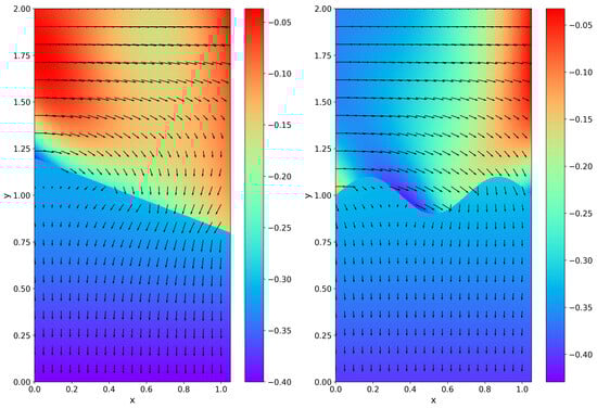 Simulation results of HC-PPINNs for Example 4, where the neural networks have three hidden layers and 16 neurons in each hidden layer. The color bar represent the approximated result of pressure and the vectors represent the velocity of the fluid. (Left) The straight-line interface. (Right) The curved interface.