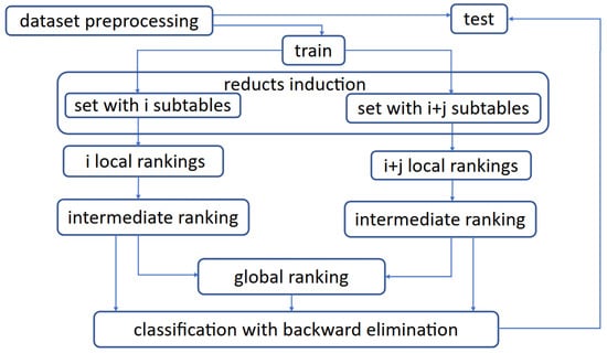 The methodology was verified through extensive experiments. The dataset was divided into k sets, , each of which included i subtables, . The subtables were obtained by the selection of attributes driven by induced reducts from the entire dataset. For each subtable in the set k, local rankings were obtained by using the greedy algorithm for decision rules induction []. Then, for each set k, a strategy for intermediate rankings construction was proposed, taking into account the properties of the greedy algorithm and the characteristics of the retrieved local rankings. Then, global weights of attributes were obtained. All rankings at the intermediate and global levels were verified from the point-of-view of classification, i.e., the gradient boosting approach [] and neural network in the form of MLP (multi-layer perceptron) []. The entropy of features, which consists of rankings, was also calculated. The constructed classifiers were controlled by the attributes’ ranking positions based on a backward elimination approach. The results of the experiments were validated against the test part of the entire dataset and analysed and compared for intermediate and global levels of ranking construction.