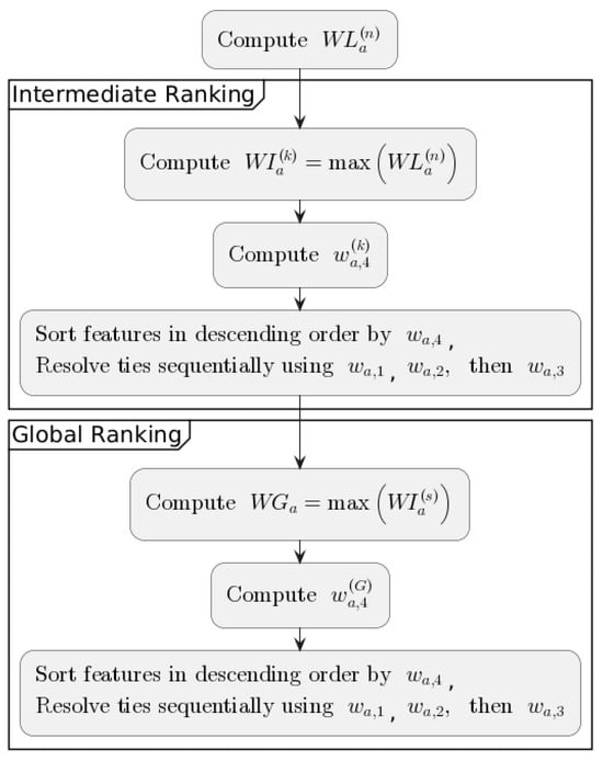 Feature selection can be approached in two main ways. The first group of methods involves ranking features based on a specific criterion and selecting the top k features. The second one focuses on identifying the smallest subset of features that maintains the performance of the learning model. In the case of ranking methods, each attribute is assigned a weight to reflect its relevance; then, attributes are sorted, usually in order from most to least relevant, and the top-ranked attributes are used in the analysis. Feature ranking methods employ various metrics, such as similarity scores, statistical measures, information-theoretic approaches, or functions derived from the outputs of classifiers [,]. These techniques aim to prioritize features based on their relevance or contribution to a given model, helping to improve interpretability, reduce dimensionality, and enhance the overall performance of the learning algorithm [,,].