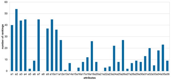 It can be seen that the attribute a2 is present in all local rankings, while the attribute a4 is present in 45 rankings out of 54; however, in the global ranking (see Table 5), a4 is in the first position. It should be noted that this figure shows the frequency of occurrence of the attributes in the rankings and not the weights, which determine the order of the attributes, as shown in Table 5 for intermediate and global levels. Attributes a8, a15, and a21 did not appear in any of the local rankings, so they are not presented in Figure 3; they also do not appear in the intermediate and global levels.