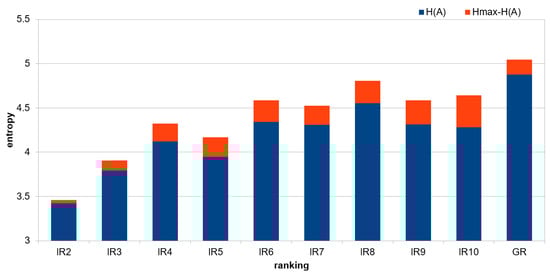 In the paper, for rankings created at higher levels, i.e., the so-called intermediate and global levels, entropy was calculated. This measure, determined for a set of attributes, assesses how much information (or uncertainty) these features contain. A high value indicates that the attribute (or set of features) is more diverse and potentially more informative []. In the context of data analysis, the entropy of a set of features is defined by the formula: