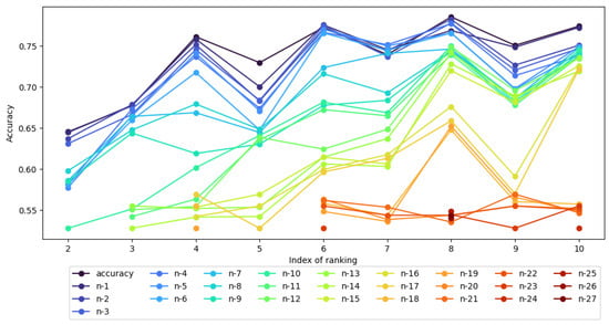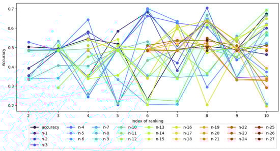 Figure 5 shows the accuracy of the XGBoost classifier for each intermediate ranking with j last features from the said ranking removed. It can be interpreted as a visual representation of Table 8. Each line and color represent a subset of attributes in general, where for each intermediate ranking: and . The line listed as “accuracy” is shows the classifier performance on all attributes from k-th ranking, or in other words, “base” performance for each intermediate ranking.