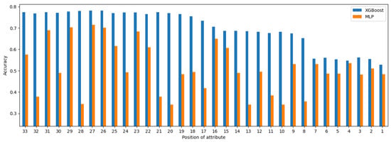Taking into account the classification accuracy of MLP and XGBoost, the low results obtained by the MLP model are related to the use of a single model, where boosting and the gradient approach were omitted. It should also be noted that in the case of the MLP, the investigation into the provision of hidden layers, nodes, and hyperparameters was omitted, as they are not the subject of this article.