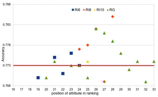 Among the intermediate rankings, the biggest improvement is seen for the RI_7 ranking, where instead of 23 attributes, 16 attributes are used, achieving a higher accuracy of classification. This number of attributes represents almost 50% of the attributes in the entire dataset. Improvements are also visible for ranking RI_2, RI_3, and RI_6. Considering the global ranking, the highest classification accuracy, surpassing the local reference point, was obtained using only 26 attributes instead of 33. The performance of the classifier at this level is the same as for attribute 26 in ranking RI_8; however, the local reference point was not exceeded in this case. Overall, the obtained results demonstrate a trend where, for attributes occupying the top positions in the rankings, the accuracy of classification generally increases as the number of attributes grows.