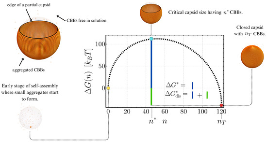 In Figure 1, we show a schematic representation of a partial capsid having n CBBs (top left corner) and a representative energy landscape for and , where three important stages of VCSA are highlighted. According to Equation (2), capsid formation starts at (yellow point), representing the situation where all CBBs are free in the solution. As the CBBs start to aggregate due to the thermal fluctuations of the bath, the free energy of the incipient shell increases, indicating that partial capsids with a small number of constituents are unstable assemblies that will tend to dissolve. Only when having a cluster with a critical size does the system reach an unstable state (cyan point) where any perturbation can cause the partial capsid to dissolve or continue assembling until it closes. If the nucleation barrier, , is surmounted, the aggregate will tend to progressively grow, ultimately forming a closed spherical capsid of size (red point).