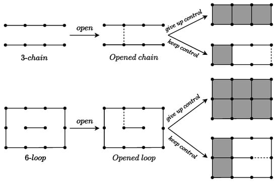 The figure shows chain and opened chain, loop and opened loop, as well as two strategies for after opening, keep control and give up control, which correspond to a 3-chain and a 6-loop, respectively.