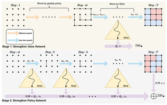 We define a threshold, “start searching” (abbreviated as ), to determine when to begin using MCTS. The entire self-play process can be divided into two stages. The first stage involves collecting data from the end to the beginning, utilizing the Q values returned by MCTS to train the value network. During this phase, the value network converges relatively quickly. As the number of training iterations and time increase, the model’s predictive capability is enhanced, which causes the value to progress forward until it reaches step 0. At this point, we enter Stage 2, where we start collecting data anew for self-play training and use the outcome z to assist in refining the value network. The introduction of the z at this juncture facilitates the convergence of the global strategy. The reward training value network is derived by combining the z and Q with weights of 0.75 and 0.25, respectively. This particular 0.75/0.25 weighting has been empirically established as effective and is widely adopted in machine game-play scenarios.