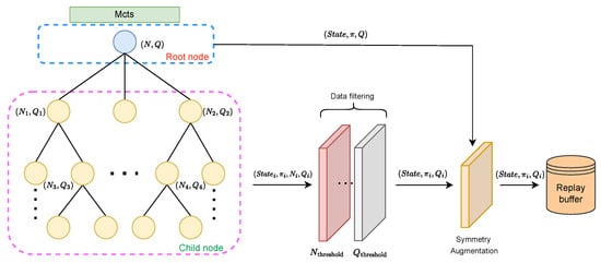 - Mitigating Data Scarcity: Typically, in traditional MCTS, only data from the root node are used for training, which may overlook high-quality nodes and necessitate a large number of simulations, thereby wasting computational resources. To address this, we introduce a constraint mechanism to filter out frequently visited high-quality nodes in MCTS for training. Experiments show that this method greatly improves the learning efficiency of the agent’s value network during the early stages of training. However, during the reinforcement training phase, we eliminate this data extraction method in the tree to enhance the policy network.
