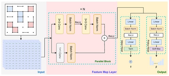The neural network structure of AlphaZero is the same as that of BoxesZero, with both using a 3-channel input layer and 6 parallel blocks in the feature extraction layer. The loss function consists of three main components: policy loss, value loss, and regularization loss. Their specific forms are as follows: