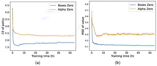 - Policy Loss: This is used to measure the difference between the predicted policy and the true policy, which is represented by cross-entropy loss, as shown in the following equation:where is the true policy distribution, and is the model’s output policy distribution.