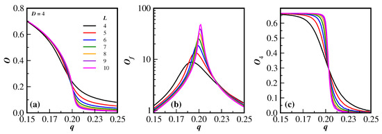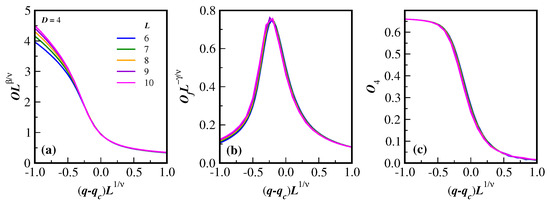 As a matter of example, the general behavior of the relevant quantities for this model in , namely O, and , given by Equations (4)–(6), are, respectively, displayed in the three panels (a), (b) and (c) of Figure 2. The different lattice sizes are listed in the legend of Figure 2a. In all these panels, only the lines of the data are shown for a clearer visualization of the dependence of the respective quantities as a function of the noise probability q. From the behavior of O, and close to the transition region, it is clear that the system undergoes a phase transition, since the derivatives of O and with respect to q increase in magnitude as the lattice size increases, as does the peak of (note that, for a better view of the peaks, the vertical axis of Figure 2b gives in a logarithm scale). In addition, the fourth-order Binder cumulants cross at the same region, which is equivalent to the critical noise transition. Similar patterns, as highlighted in this figure, have been previously obtained for and are also obtained for and 6. However, as will be seen below, the cumulant crossings for higher dimensions are not as well defined as for the case . Some details about extracting the critical properties of the model from this kind of data are discussed below.