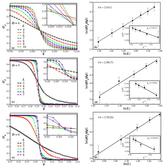 Let us first consider the fourth-order Binder cumulant of the order parameter , as a function of the disorder parameter q, which is depicted in the left panels of Figure 3 for several lattice sizes L and dimensions D. In panels Figure 3a,c,e, we have , , and , respectively. One can clearly see from panel Figure 3a for that the system undergoes a second-order phase transition, since the cumulants tend to cross at the same value q, which corresponds to the critical disorder parameter [20]. In the axis scales used in Figure 3a, one can make a rough estimate of the critical noise and the universal value of the Binder cumulant and , respectively. It can also be noticed from Figure 3c,e (, that we do not have a clear estimate either of or . This is a result of the smaller lattices that were used, because the number of sites to be simulated exponentially increases with D. Nevertheless, from the inset of the left panels, it is seen that the slope of systematically increases with the lattice size. From the maximum value of the slope of with respect to q, one is able to obtain the correlation length exponent . The magnitude of the derivative was numerically computed from the original simulated data. The ln-ln plot of this derivative, as a function of the lattice size L, is illustrated in the main graphs of the right panels of Figure 3 for each considered dimension D. The slope of the linear fit of the data, according to Equation (10), corresponds to the exponent ratio . The values of are given in the proper figures. In dimensions and , the smaller lattices have not been taken in the linear fit.