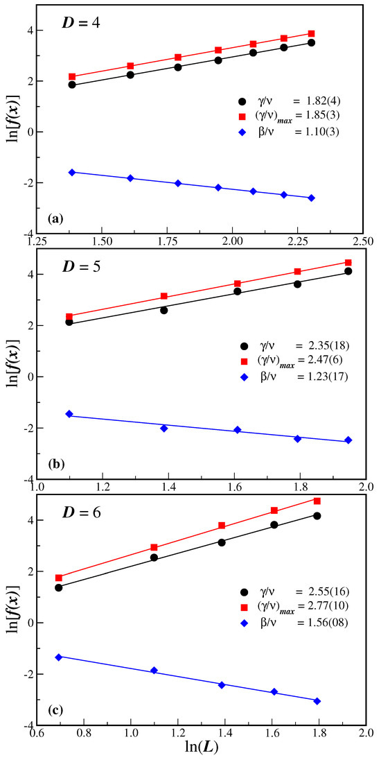 The estimate of the critical noise probability allows us now, through Equations (7) and (8), to evaluate the critical exponent ratio and by just computing the order parameter and its fluctuation at for different lattice sizes L and spatial dimensions D. In the case of , we also have its maximum value at the noise probability . Figure 4 depicts the ln-ln plot of these quantities as a function of the system size L. The corresponding slopes of the linear fit give the respective critical exponent ratios and are written in the legends of Figure 4a–c for , , and , respectively. Although and have different values for each lattice size, the exponent estimates agree well within the error bars.