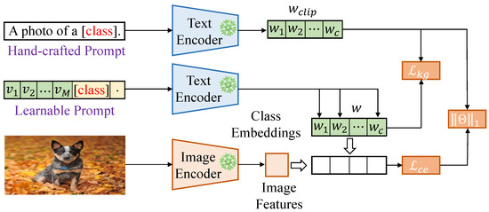 Advances in recent studies indicate that models synthesizing image–text connections outperform those solely analyzing visual inputs, leading to the creation of potent visual-language models. Such models, rooted in image–text correlations, are referred to as visual-language models (VLMs). Enhancements in VLMs are achieved through several methods: firstly, by deploying more robust textual or visual encoders, such as Transformers [14]; secondly, by applying contrastive representation learning techniques [15]; and thirdly, by integrating an expanded set of imagery [1,3]. Given the dependency of VLM training on extensive labeled datasets, methods like unsupervised or weakly supervised learning are employed to educate the VLMs using images without annotations [16]. Notably, techniques like Masked Language Modeling (MLM) enhance the resilience of visual and textual embeddings by intentionally omitting words from the text [17,18]. Concurrently, Masked Autoencoders [19], which obscure random sections of an input image, have proven to be efficient self-supervised learners. An exemplar of this field is CLIP, which leverages contrastive loss with a visual encoder over an enormous corpus of 400 million image–text pairs, showcasing its adaptability to categories it has not previously encountered. In our approach, we leverage the pre-trained CLIP model, similar to its predecessors CoOp and CoCoOp, to facilitate knowledge transfer. Our proposed method aims to balance the generalization ability of base and novel classes and further improve the performance.