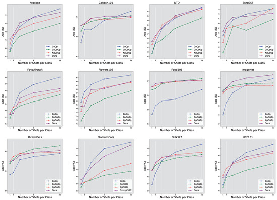 Training Details. Our implementation was based on CoOp’s codes [12] ( https://github.com/KaiyangZhou/CoOp (accessed on 10 March 2025)) with the CLIP model. We conducted the experiments based on the vision backbone with ResNet-50 [25] and Vit-B/16 [24]. Inspired by CoOp, we fixed the context length to 4 and initialized the context vectors using the template of “a photo of a []”. The final performance was averaged over three random seeds for a fair comparison. We followed the same training epochs, training schedule, and data augmentation setting in CoOp. The hyperparameter was set to 8.0. All experiments were conducted based on RTX 3090.