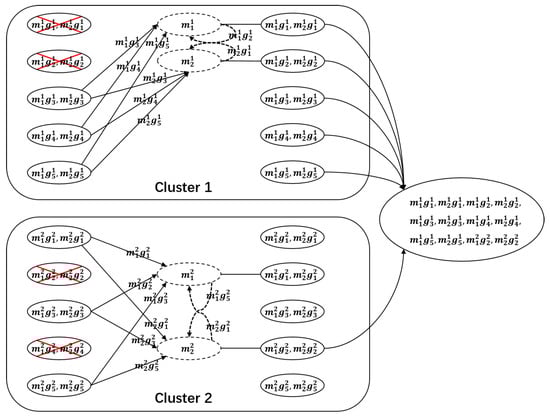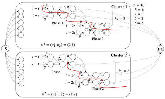 We give an example of the information flow graph for two clusters here. As shown in Figure 1, the file is stored in nodes, which are divided into clusters, and each cluster has nodes. In each cluster, nodes are being repaired simultaneously. The data collector can retrieve the file by connecting to nodes, where nodes from cluster 1 in two phases with , and nodes from cluster 2 in two phases with .