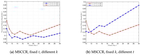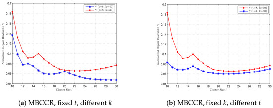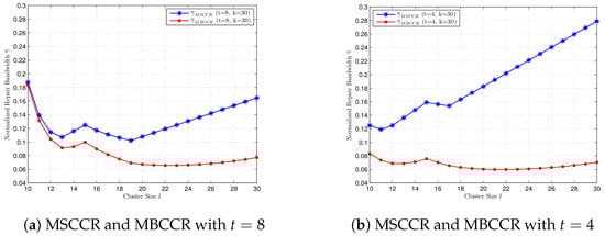 Comparison of the normalized repair bandwidth at the MBCCR point for cluster size , with different k and t, respectively. (a) , , and . (b) , , and .